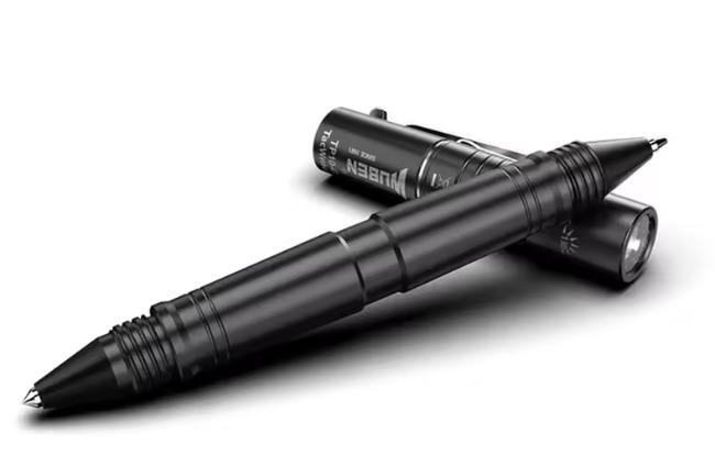 Su diseño multifunción combina punta de ataque en un extremo y bolígrafo en el otro, fabricado en aluminio aeronáutico de alta resistencia, con certificación IP68, lo que la hace completamente impermeable y apta para condiciones extremas. Funciona con batería recargable interna y carga por Micro USB.